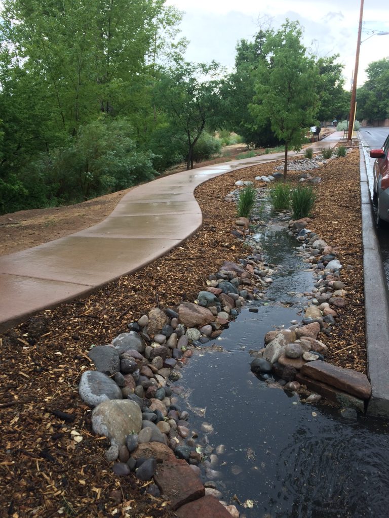 Curb cuts allow stormwater to enter into the garden. A sediment trap allows street debris to accumulate below grade, which can then be cleaned periodically.