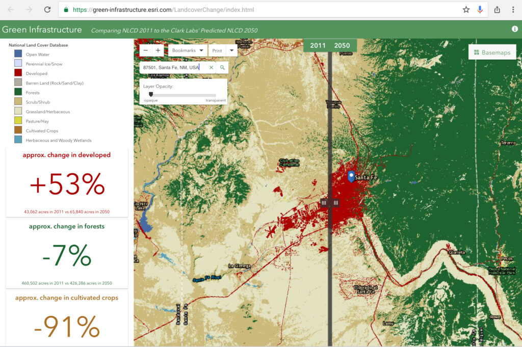 Here photographed is the split screen for Santa Fe. It estimates 53% increase in developed land, which basically turns the entire city to red. This model is clear, user friendly, and makes poignant the need to plan urban forest core area locations before and in conjunction with development.
