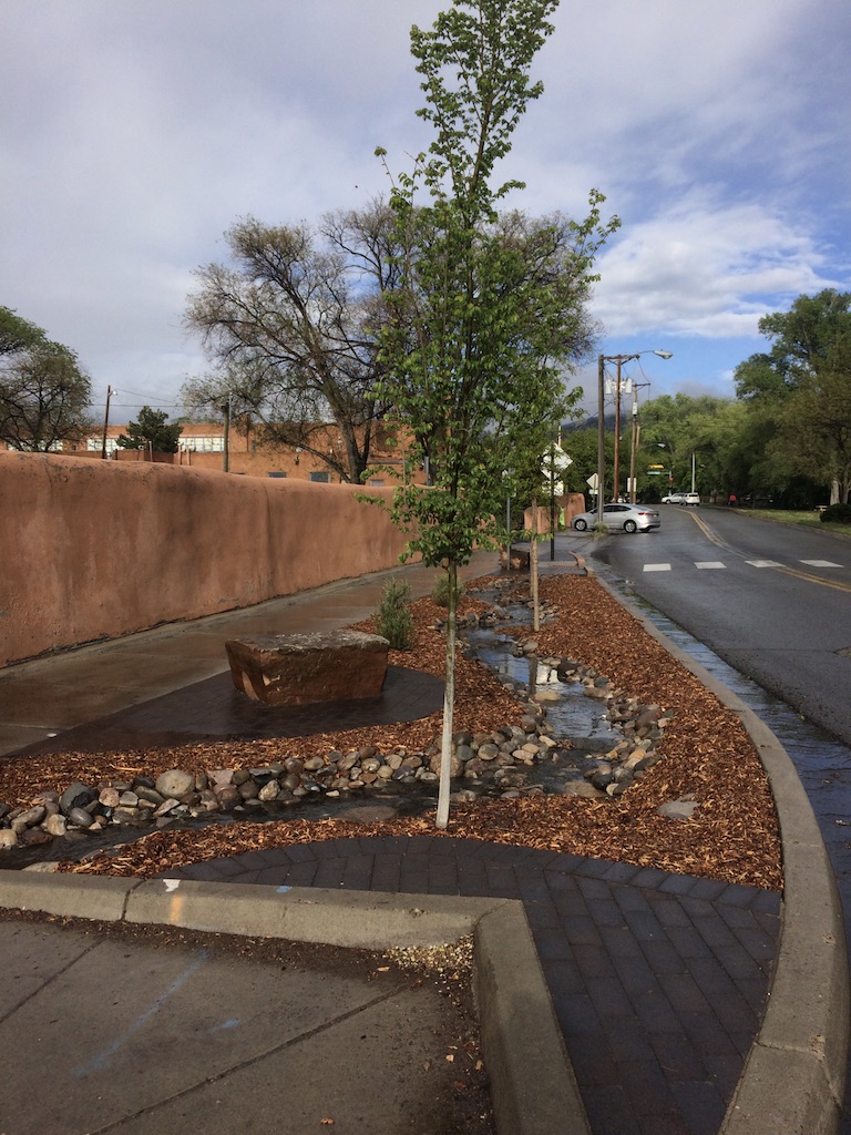 Since the design with the lagunita was installed in 2017, frontier elms (Ulmus carpinifolia x parvifolia) have each grown two inches in caliper, and the burr oaks (Quercus macrocarpa) have grown incrementally related to closeness to the curb cut: 1.25 inches, 1 inch, and 0.75 inch respectively.