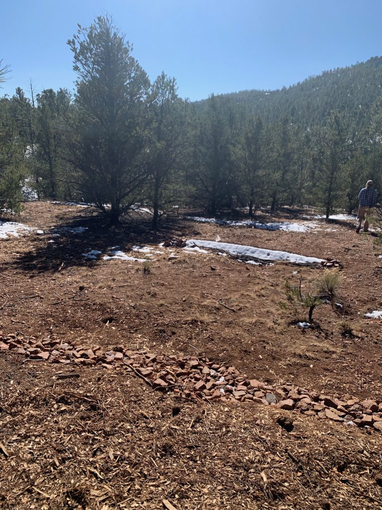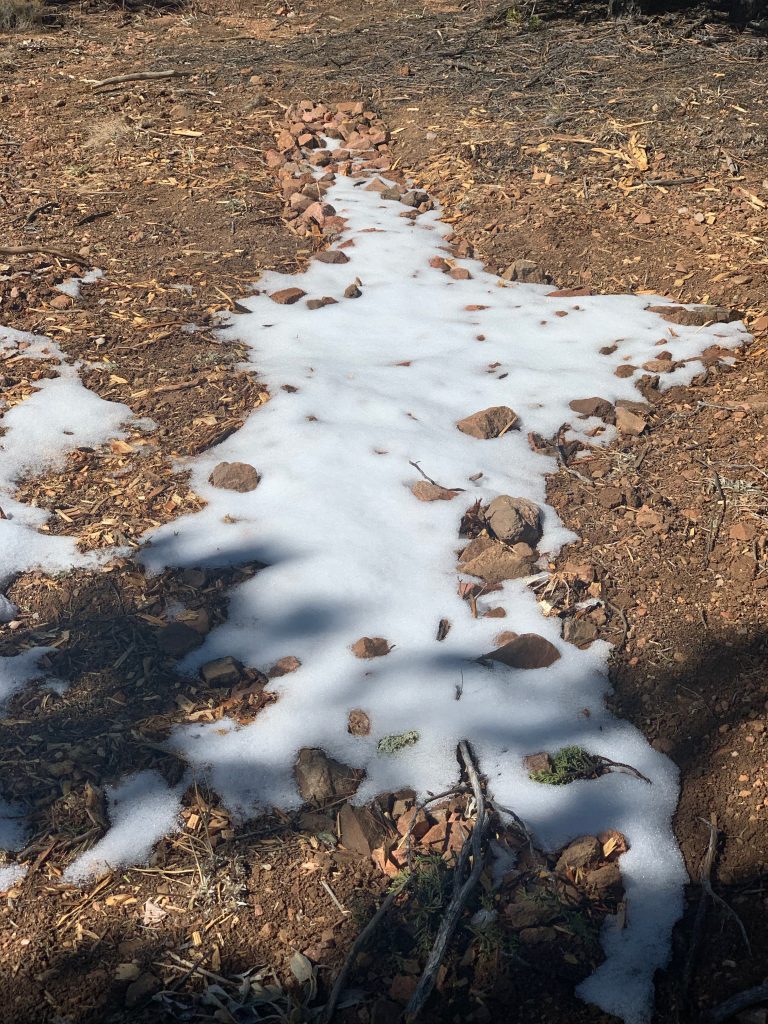 As evidenced from these photos taken after a snowstorm, a lagunita retains moisture longer than surrounding soil. This illustrates that water binds to water and that the below-surface mulch has significant water-holding capacity. With the lagunita veins stretched across a slope’s contour, water sinks as it travels downhill, collecting in a place that provides valuable accessibility to roots.