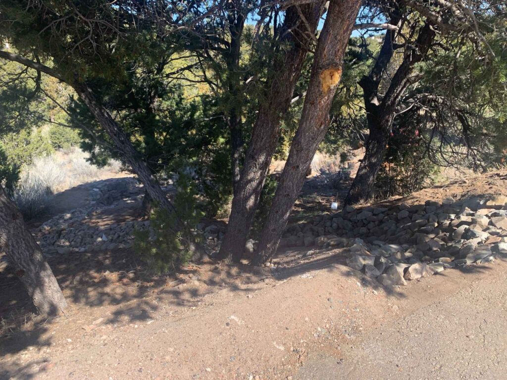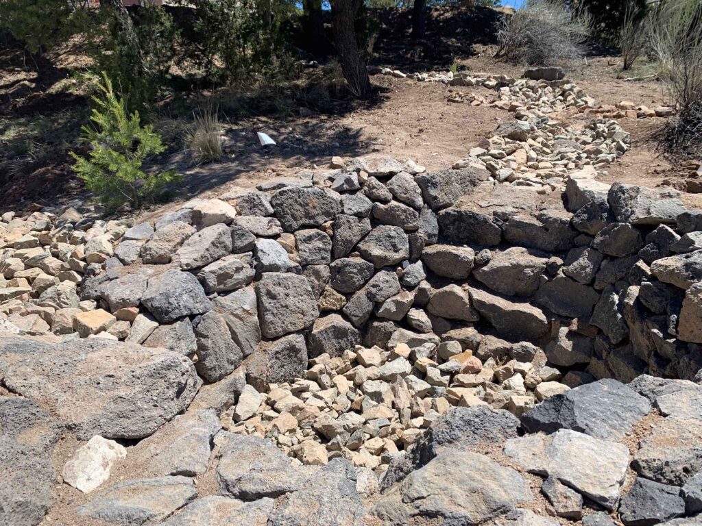 Beginning at the edge of the parking lot, rock work and a compacted soil berm help guide stormwater runoff to a dry riverbed, which winds its way down a steep slope. Lined with angular rocks, the riverbed helps slow the speed of water and prevent erosion, encouraging infiltration into the soil to help support existing trees and new plantings. A lagunita cuts perpendicular to the path of the dry riverbed, helping with additional water infiltration for existing trees on the slope. At the end, there is a Zuni bowl to capture and hold water, with a stepped headcut pour-over to further help slow any deluges of stormwater. The Zuni bowl has an overflow with erosion control rock work as well, just in case. Buried underneath the bowl is a log inoculated with mycorrhizae to help build microbial networks in the soil that will benefit the new and existing trees and plants nearby.