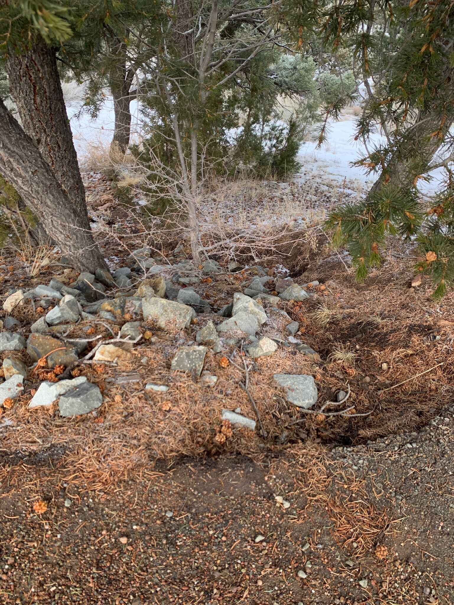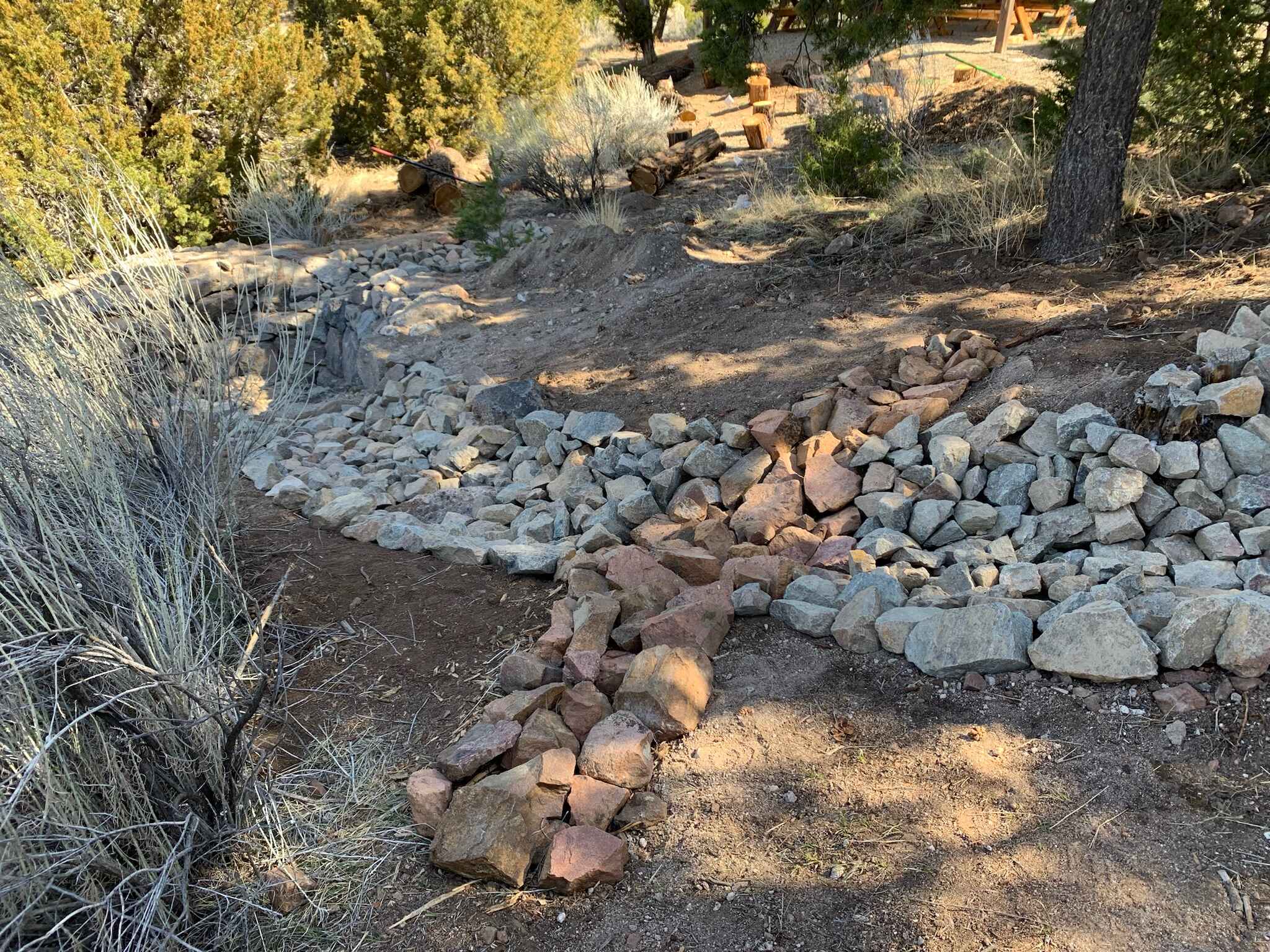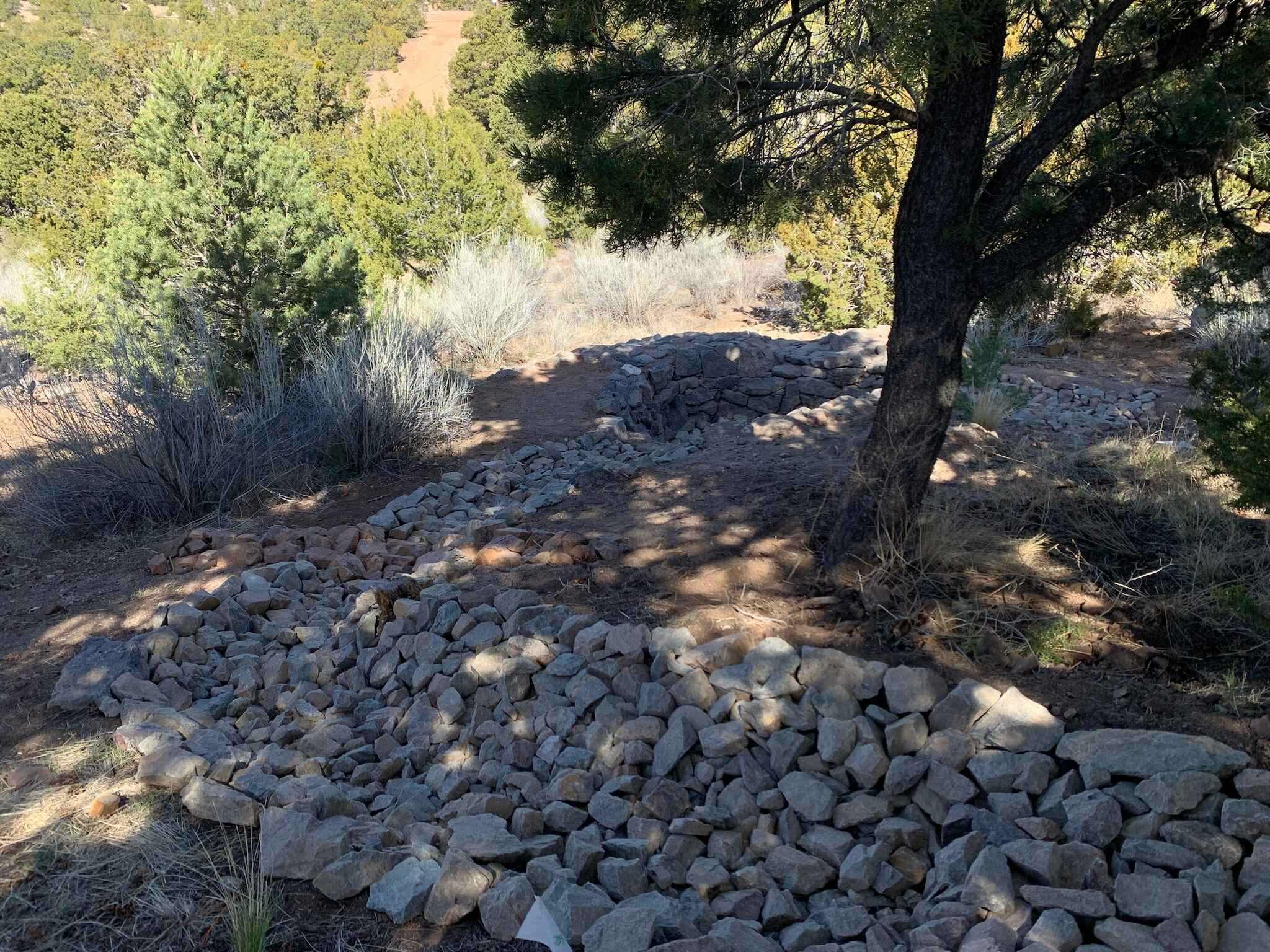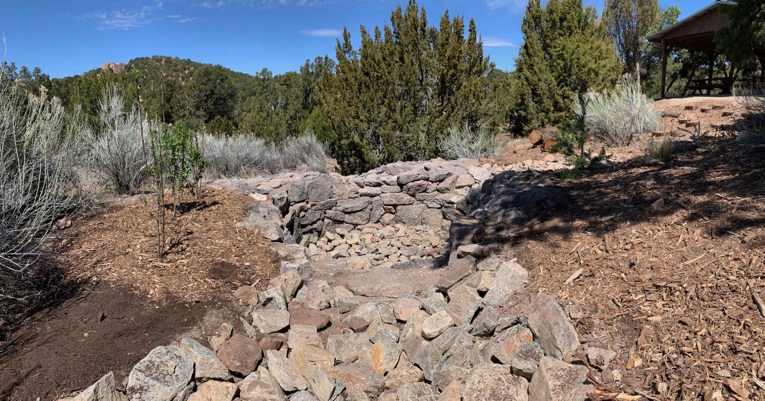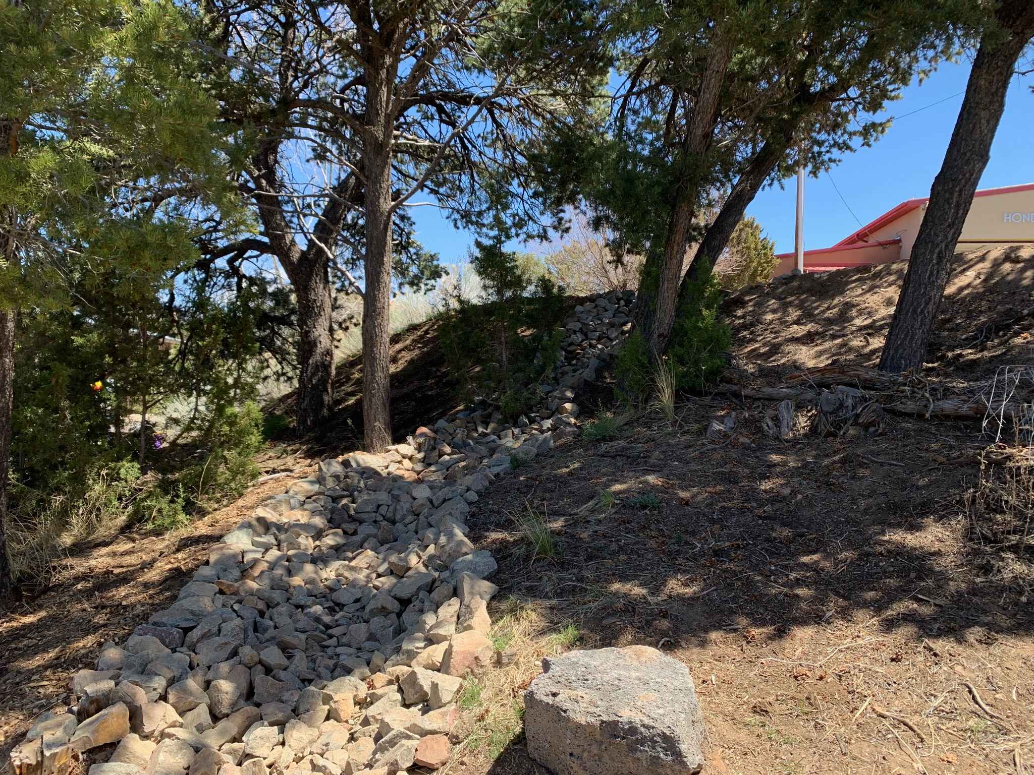 Beginning at the edge of the parking lot, rock work and a compacted soil berm help guide stormwater runoff to a dry riverbed, which winds its way down a steep slope. Lined with angular rocks, the riverbed helps slow the speed of water and prevent erosion, encouraging infiltration into the soil to help support existing trees and new plantings. A lagunita cuts perpendicular to the path of the dry riverbed, helping with additional water infiltration for existing trees on the slope. At the end, there is a Zuni bowl to capture and hold water, with a stepped headcut pour-over to further help slow any deluges of stormwater. The Zuni bowl has an overflow with erosion control rock work as well, just in case. Buried underneath the bowl is a log inoculated with mycorrhizae to help build microbial networks in the soil that will benefit the new and existing trees and plants nearby.