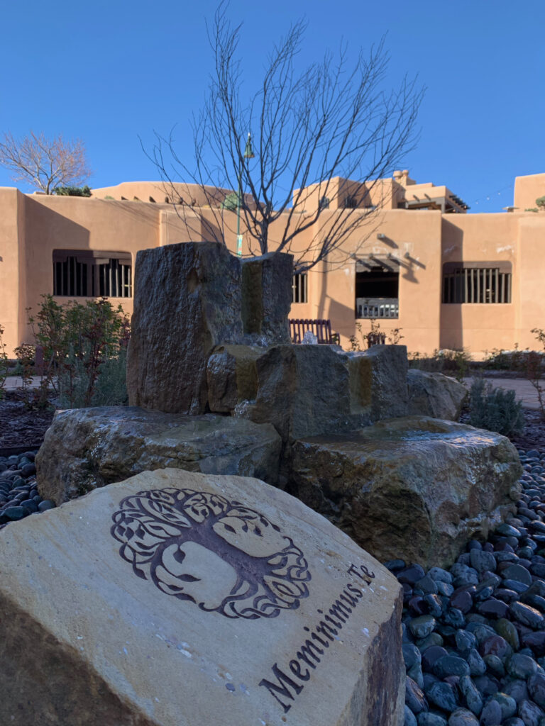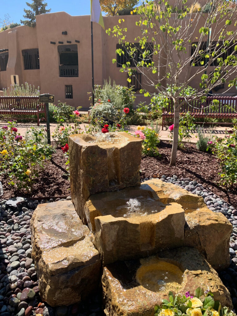 Large sandstone blocks from Cerro Colorado, Lamy, NM — originally quarried to build the Cathedral — had been stored for some time at St. Teresa’s Carmelite Monastery in Santa Fe until they were moved to the Cathedral property in June 2020. Master stonemason John T. Morris and his team at New Mexico Stone in Santa Fe carved five of these raw sandstone blocks into a cascading water fountain, with arches suggestive of a tree’s canopy, another reference to the Tree of Life. The memorial is meant to be a permanent and lasting presence, and is open to the public on the front terrace of the historic Cathedral Basilica of St. Francis of Assisi.