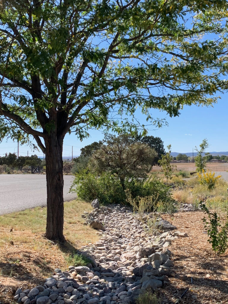 Despite its relatively small dimensions — the whole space is about 21’x131’ — this design contains a wide variety of trees and shrubs. Along with the three trees already growing in this spot, more were added to highlight both native species and others that, while not often grown here in Santa Fe County, are actually well-suited to the region. Tree species include Ponderosa Pine, Honey Locust, Cinquapin Oak, Espresso Kentucky Coffee Tree, and Curl-Leaf Mountain Mahogany, and shrub species include Nanking Cherry, Three-Leaf Sumac, and Littleleaf Mockorange.